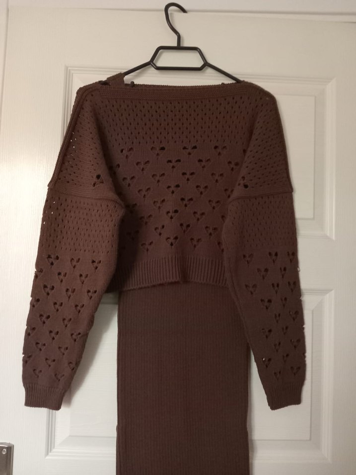 2 ayrı parçalıdır. Ayrı olarak kazağını da kullanmıştım. 2 kez giyildi. Ayrı olarak elbisesi de giyilebilir. Örgü tarzındadır. Midi boy. S-M bedene uyum sağlayacaktır.