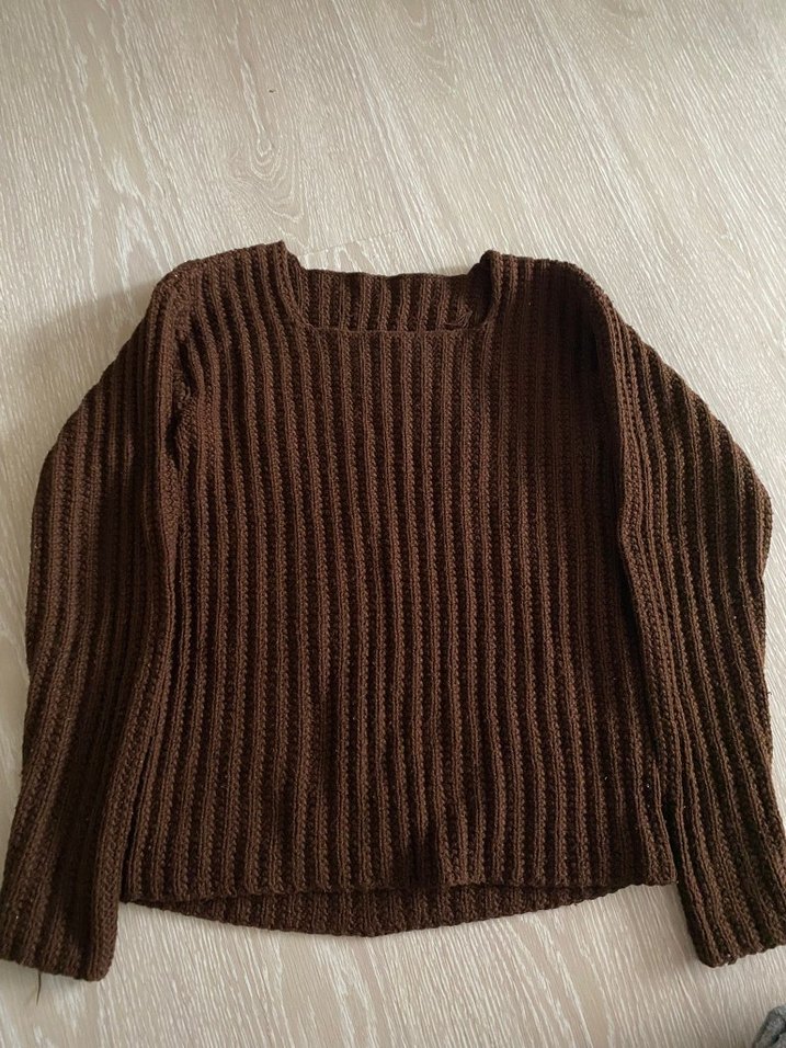 Kahverengi örgü kazak, yuvarlak yaka ve uzun kolludur. Bol kesimi ve normal boyuyla rahat ve sade bir görünüm sunar.
