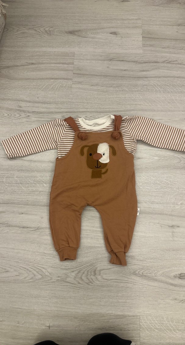 Uzun kollu, kahverengi örme dokulu bebek tulumu. Önünde baskılı köpek deseni ve yuvarlak yakası vardır. Rahat ve yumuşak kumaşlıdır. Yıkandı ama giyilmedi