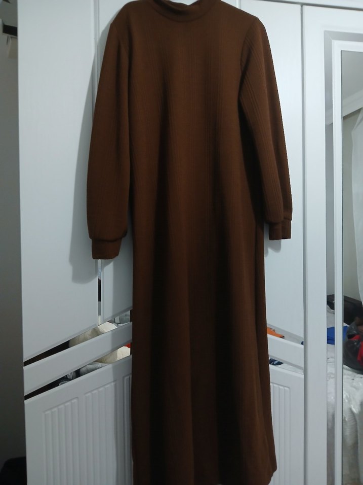 Yüksek yakalı ve uzun kollu, kahverengi uzun elbise. Rahat kesimli ve drapeli tasarıma sahip, yumuşak ve sıcak dokulu kumaştan üretilmiştir. Günlük kullanıma uygun, sade ve rahat stil sunar. pek giylmedi ramazana özel ucuza veriyorum (46/48 beden)
