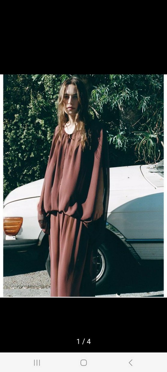 Uzun, salaş kesim kadın elbisesi, yüksek yakalı ve uzun kollu, kahverengi ve ipeksi dokulu, drapeli tasarıma sahiptir. xl beden