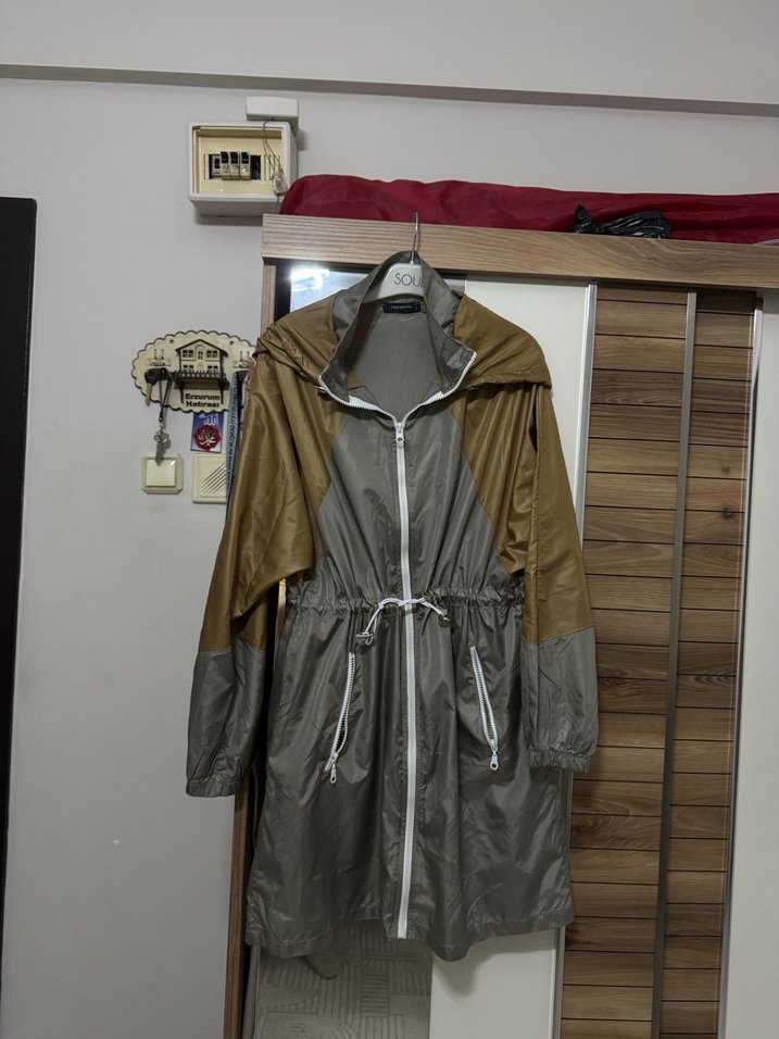 Yüksek yakalı, bol kesim ve fermuarlı ön kısmı olan kadın yağmurluğu. Sentetik kumaştan, kahverengi ve gri tonlarında sokak stili. Midi boy ve belde ayarlamalı.