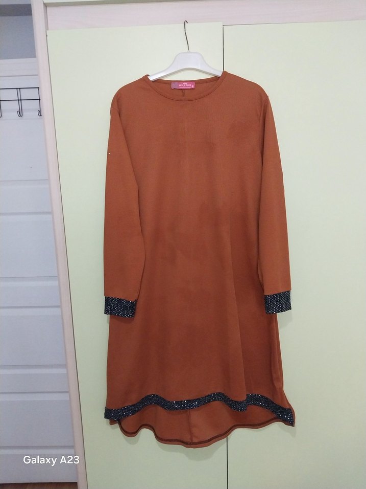 Uzun kahverengi süet tunik, bol kesim ve yuvarlak yaka ile. Manşet ve etek ucundaki parlak detaylarla sade ama şık bir görünüm sunar. Günlük kullanım için uygun.