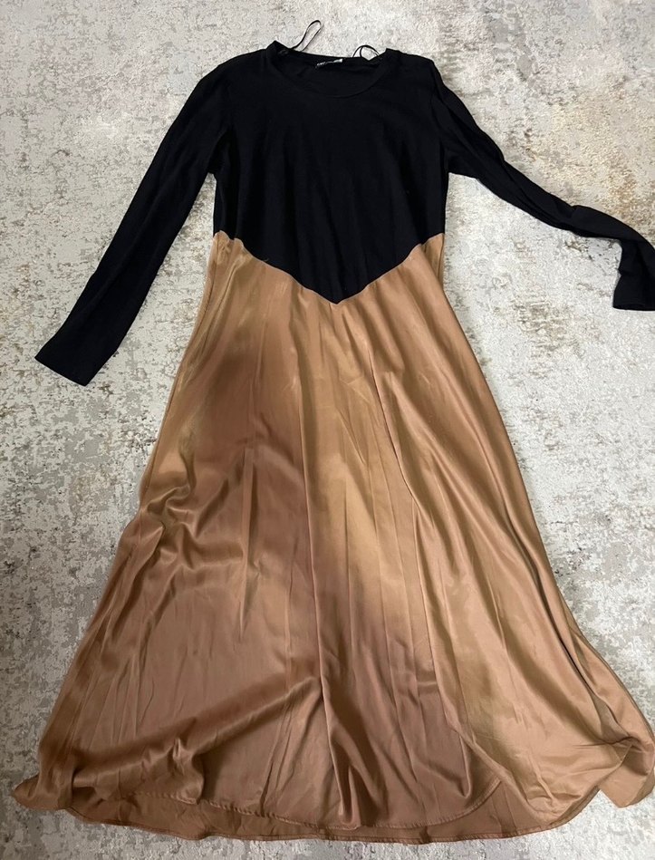 Bu uzun elbise, ipeksi kumaş ve drapeli tasarıma sahip, V yakalıdır. Uzun kollu ve bol kesimdir, koyu ve kahverengi tonlarla rahat ve şık bir sokak stili sunar.