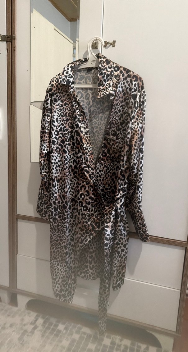 Uzun kollu, bol kesim ve koyu kahverengi yılan desenli kadın elbisesi, Paris sokak modasını yansıtıyor.