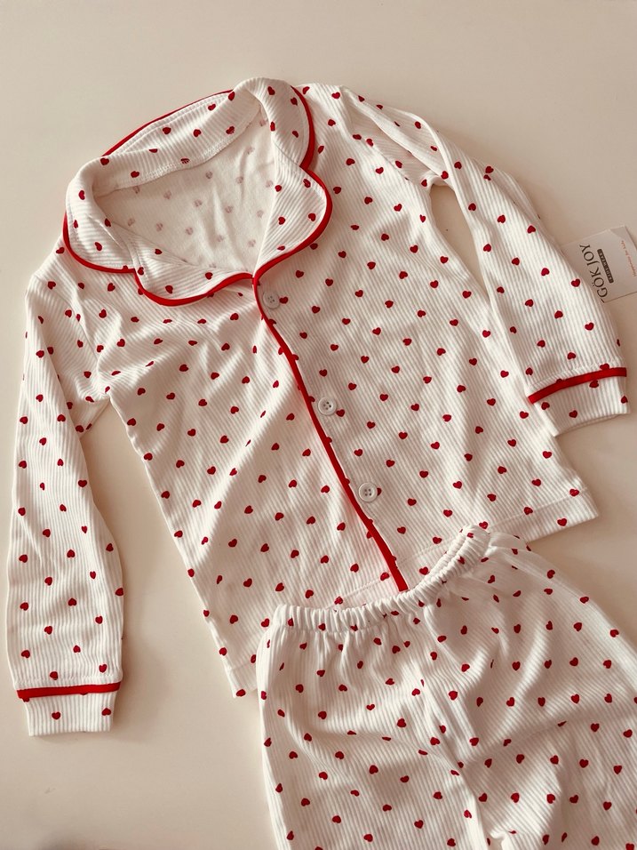 Uzun kollu, kalp desenli ve düğmeli yakalı çocuk pijama takımıdır. Beyaz zemin üzerine kırmızı küçük kalp desenleri ve midi boy, lastikli bel pantolon içerir. ❤️