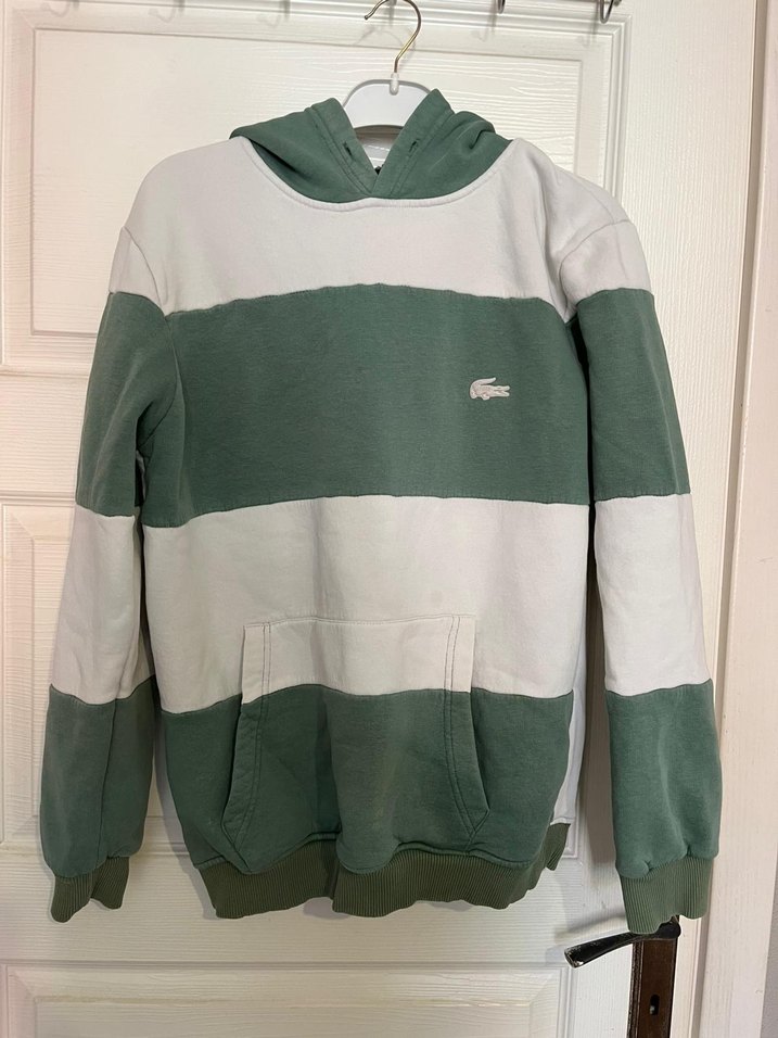 Erkekler için uzun kollu, kapüşonlu ve bol kesim sweatshirt. Yeşil ve gri renk bloklu, ön cepli. Yumuşak ve sıcak kumaştan üretilmiştir.
