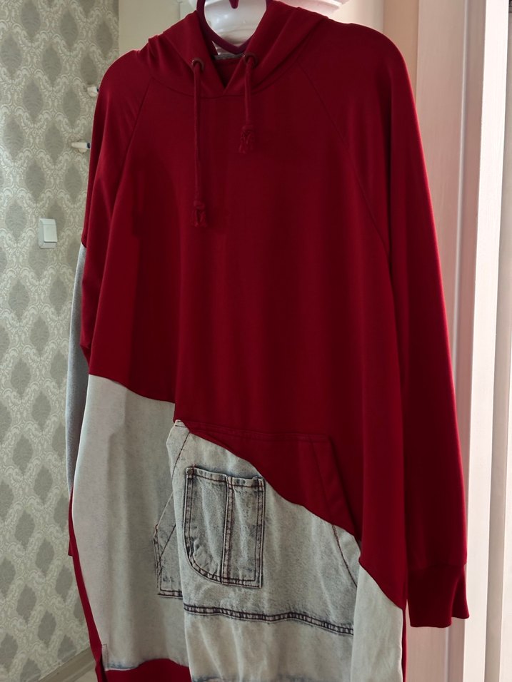 Kadınlar için uzun kollu, kapüşonlu, midi boyda ve bol kesim kırmızı üst ile kot detaylı denim alt kısmı birleştiren sweatshirt.