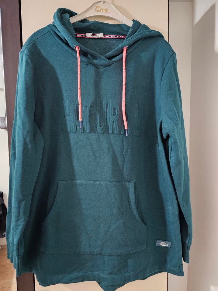 Uzun kollu, kapüşonlu ve önü cepli turkuaz sweatshirt, pembe ip detaylarıyla rahat ve şık bir sokak giyim parçasıdır.