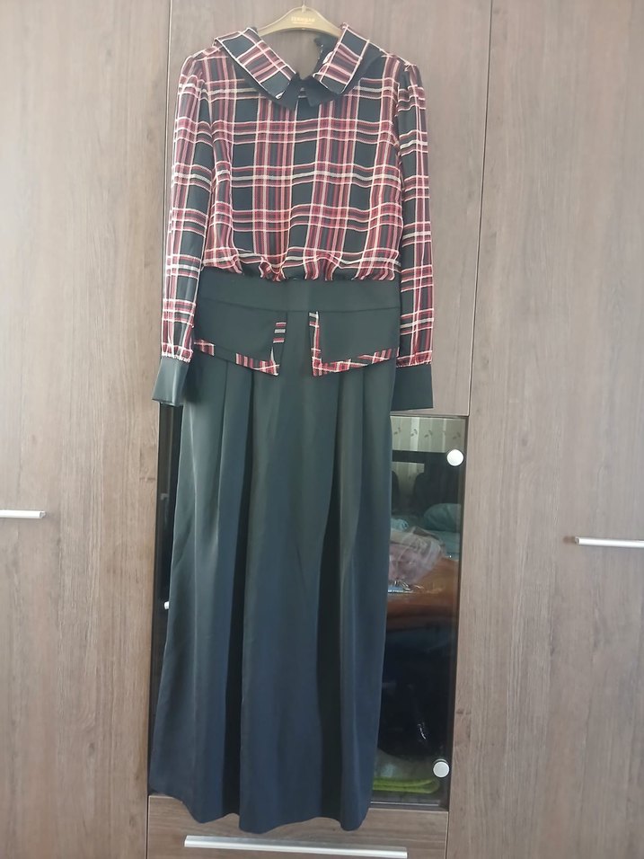 Uzun Kollu Kareli Kadın Elbise