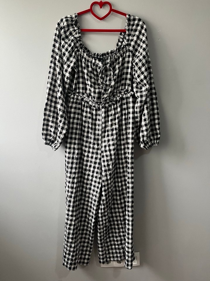 Kadınlar için bol kesim, kareli desenli, düğmeli ve tekne yakalı pamuklu uzun kollu tulum. Günlük sokak stili için bohem tarzıyla uyumlu.
