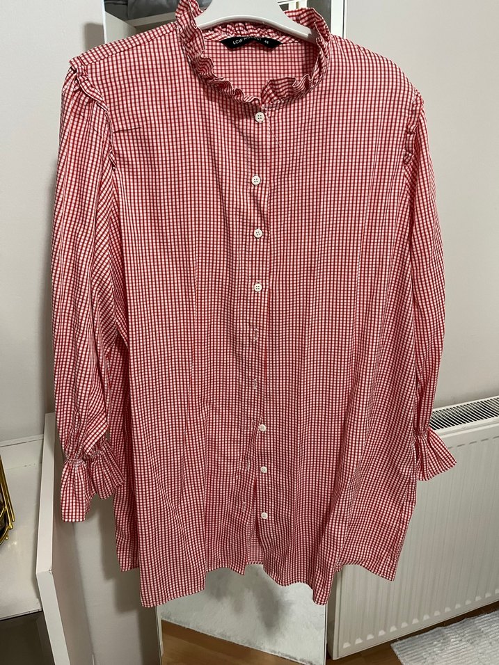 Kırmızı kareli, düğmeli ve yakalı kadın gömleği. Uzun kollu, fırfırlı manşetli ve pamuklu kumaştan, rahat kesim günlük kullanım için uygun.