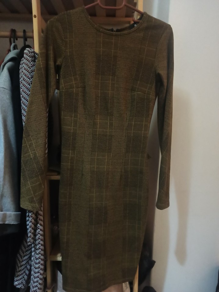 Temiz durumdadır. Ölçü bilgileri fotoğrafta bulnuyor. Kahverengi kareli, uzun kollu, yakası kesik, kemerli midi triko elbise. Rahat kesimi ile ofis ve günlük kullanıma uygundur.