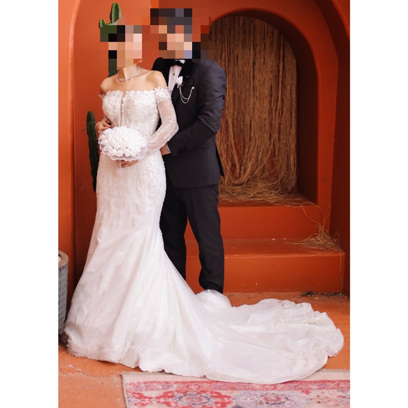 Uzun kollu, straplez yakalı, klasik kesim beyaz gelinlik, vücuda oturan A kesim ve uzun kuyruk detayına sahiptir.60 kilo ve boy1,62 bir kez giyildi