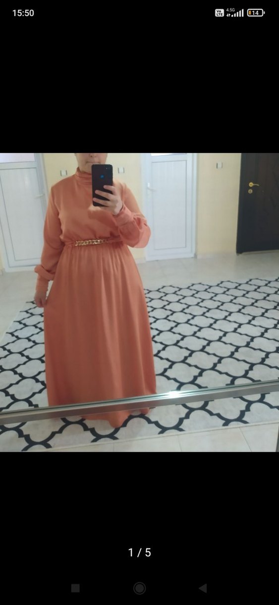 Yüksek yakalı, uzun kollu ve kemerli bu uzun elbise, yumuşak ve ipeksi bej kumaştan yapılmıştır. Minimalist günlük kullanıma uygundur.