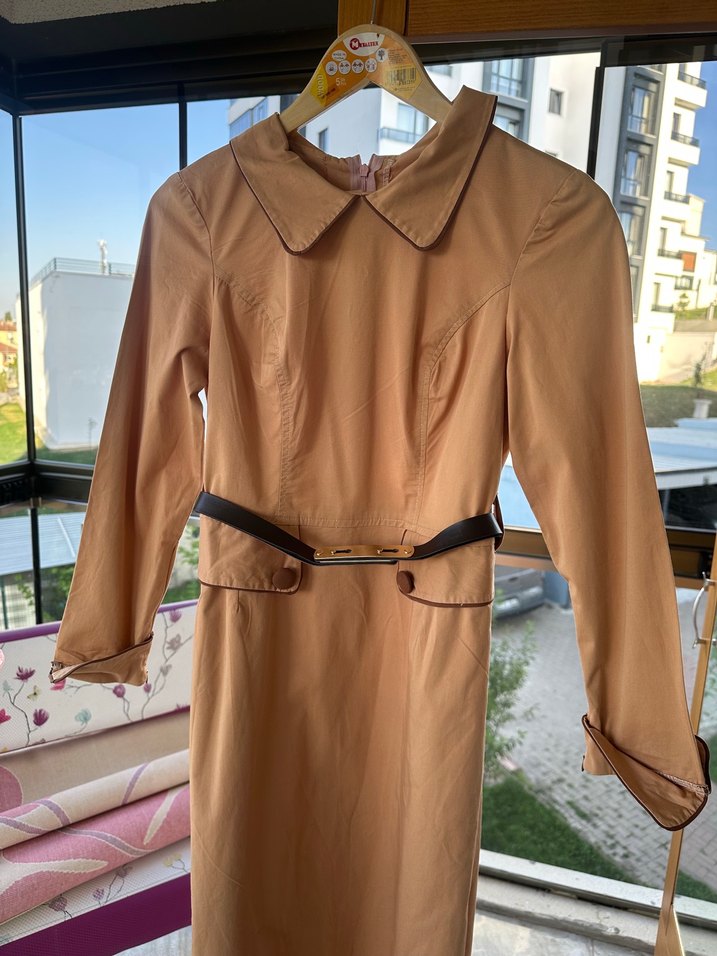 Bisküvi renkli, uzun kollu ve kemerli bu elbise, yakası kesik ve ipeksi kumaştan yapılmıştır. Ofis için uygun, klasik ve şık bir tasarımdır. Özel dikimdir.deforme yoktur ✨