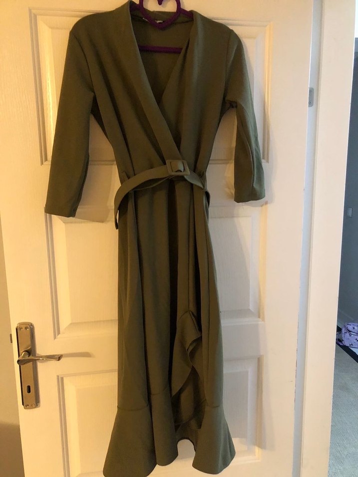 Notched yaka ve kemerli, uzun kollu haki renkte el bise Regular kesim ve desensiz tasarıma sahiptir.