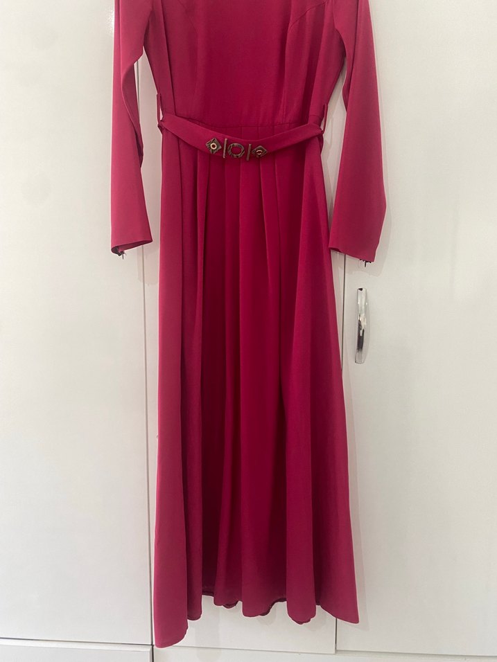 Bordo renkli, uzun kollu ve kemerli kadın elbisesi, tek renk ve bol kesimdir. Tekne yakalı ve sentetik kumaştan, düğün için uygundur.