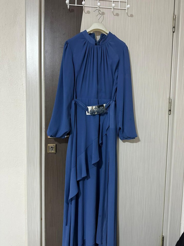 Uzun, elbise yüksek yakalı Kemerli mavi