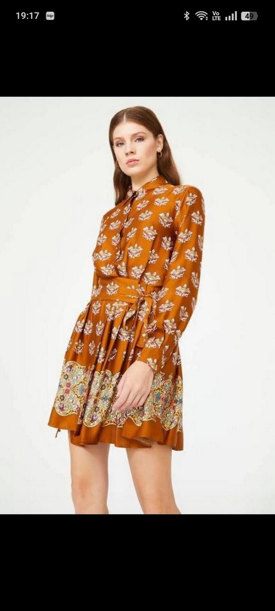 Kahverengi, uzun kollu, yüksek yakalı ve kemerli mini bohem elbise. Yumuşak ve parlak kumaştan, bol kesim ve batik desenli, günlük kullanıma uygun.