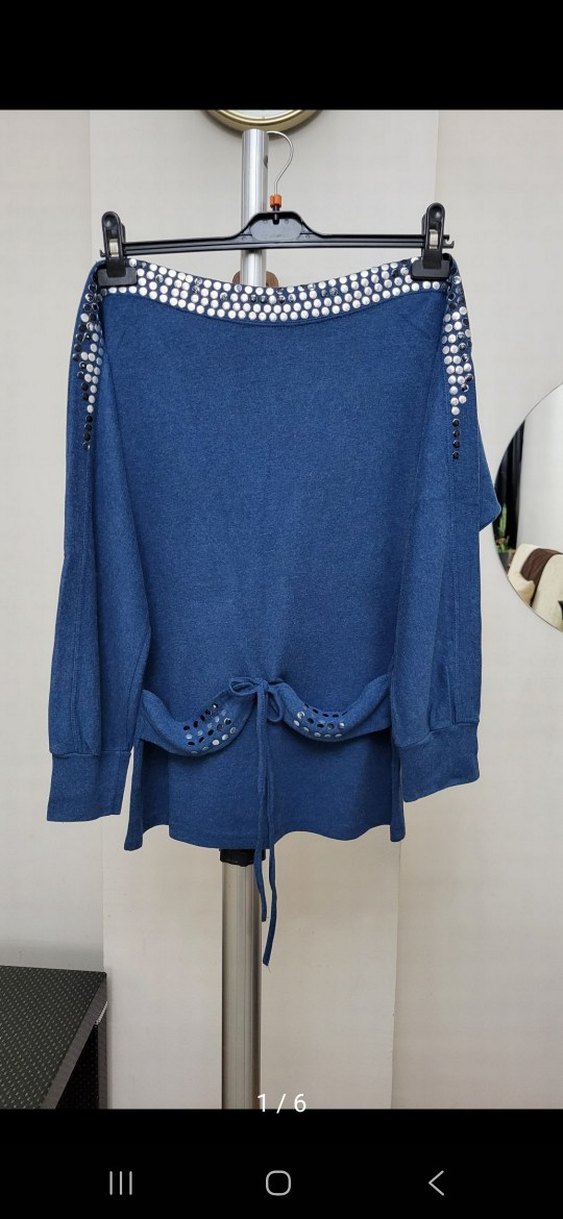 Uzun yarasa kollu, yuvarlak yakalı ve kemerli mavi denim kadın kazak. Salaş kesim, midi boy ve desen içermeyen günlük kullanıma uygun rahat bir tarz sunar. 36-38 beden uyumlu.