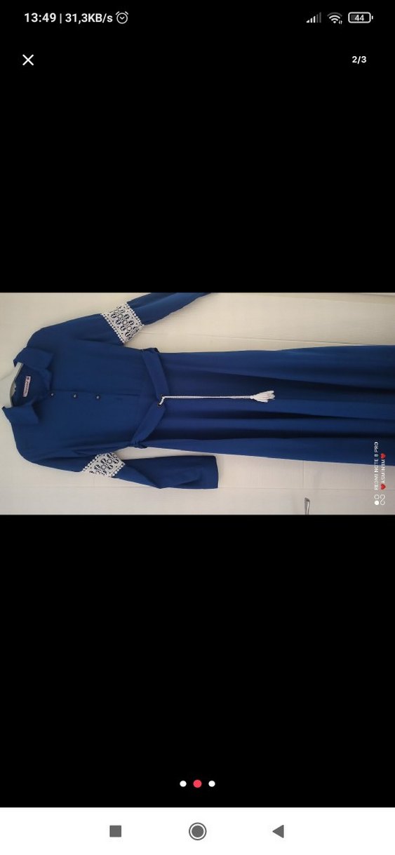 Uzun Kollu Kemerli Mavi Nakışlı Elbise