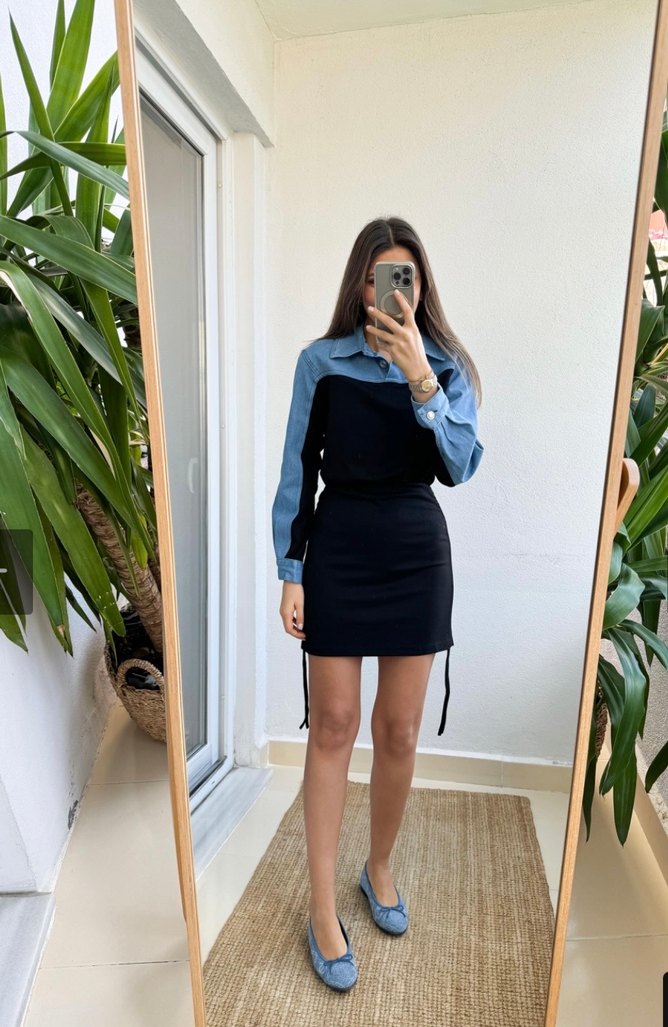 Uzun kollu ve kot kumaştan yapılmış siyah mini elbise. Ofis ve sokak stili için uygun, trend bir görünüm sunar.