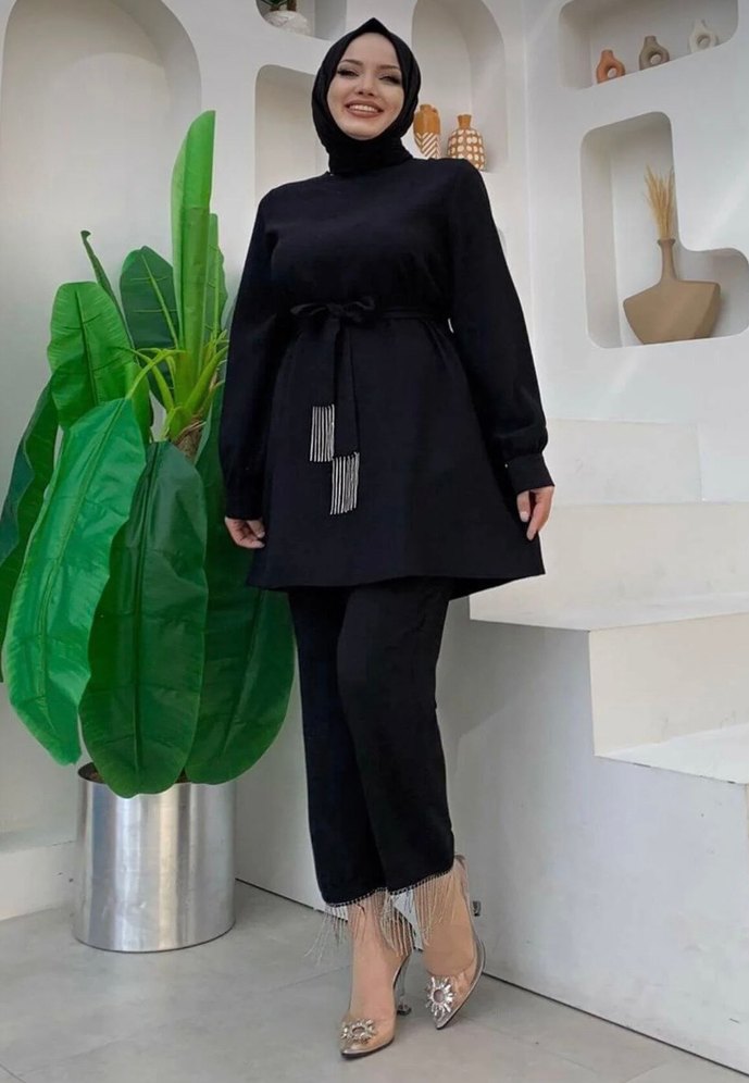 Uzun Kollu Kemerli Siyah Kadın Tunik