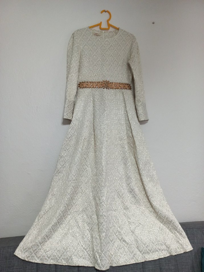 Uzun kollu, beyaz elbise tekne yaka ve kemerli bel ile vintage tarzda, hafif dokulu kumaştan yapılmıştır. Düzenli kesim ve klasik şıklık sunar.