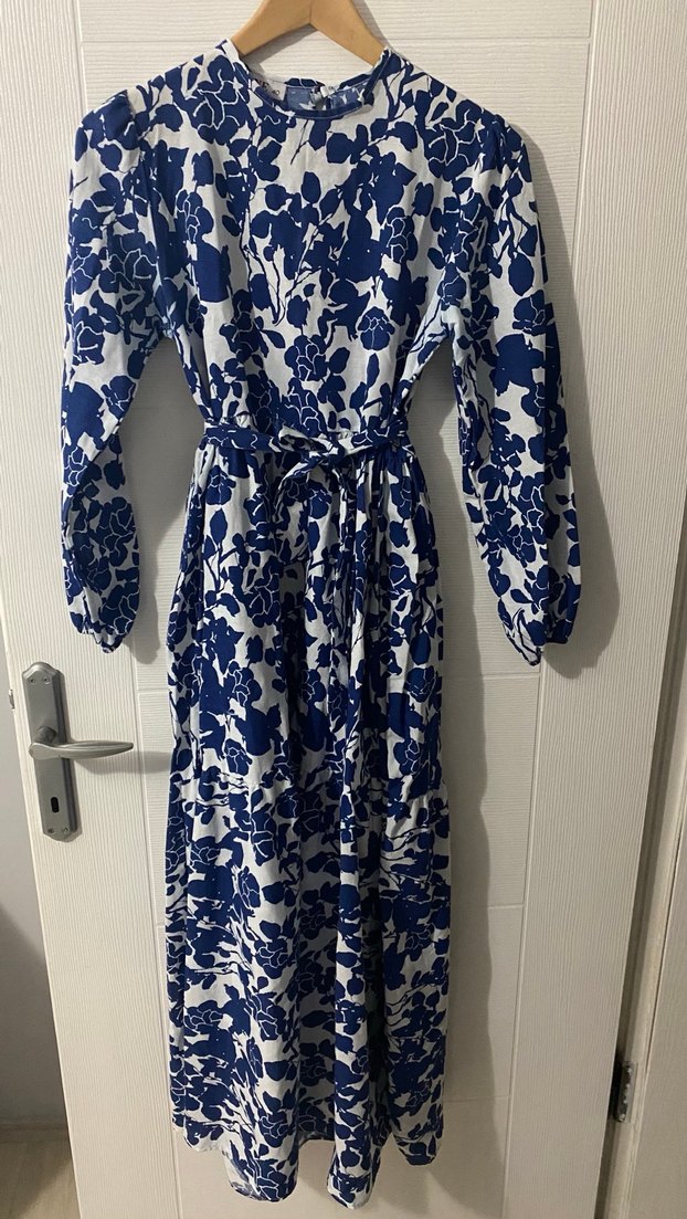 Uzun kollu, yüksek yakalı ve bol kesimli mavi elbise. Çiçekli batik desenli ve beli kuşaklı, bohem tarzını yansıtıyor.İki defa giyildi boy ölçüsü için yardımcı olurum