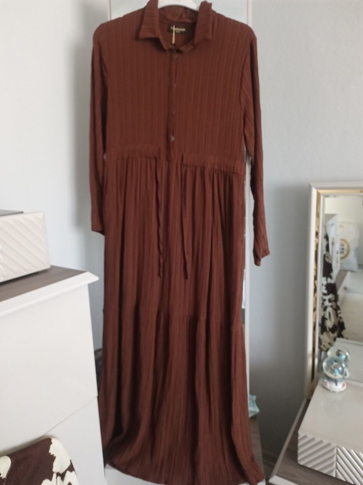 Kahverengi uzun elbise, yüksek yakalı ve pliseli tasarıma sahip yumuşak keten kumaştan yapılmıştır. Bol kesim ve uzun kolludur, günlük kullanım için uygundur.