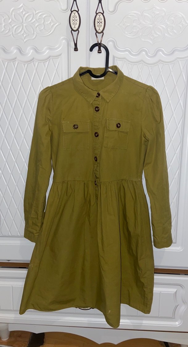 Keten kumaştan yapılmış, uzun kollu, düğmeli ve bol kesimli açık haki renk kız elbisesi. Notched lapel yaka ve desensiz sade tasarım içerir. Kızım karne günü için aldı 1,2kez felan giydi yırdık defolu değil yeni gibi kızımda büyüyünce koymak istedim Lc waikikiden aldık