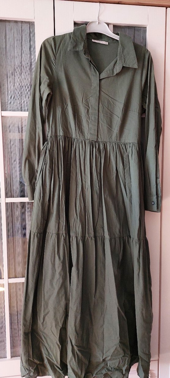 Keten kumaştan, uzun kollu, yakalı ve pilili salaş kesim uzun elbise. Minimalist ve bohem tarzda, günlük kullanıma uygun.