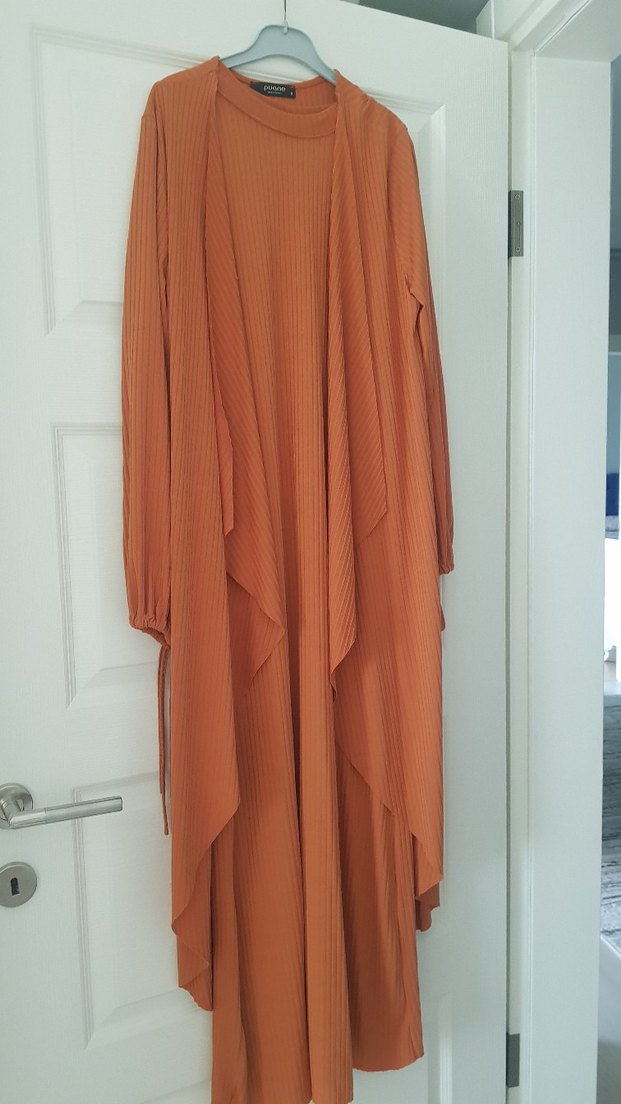 Uzun kollu, pilili ve bol kesim kiremit elbise. Yüksek yakalı, minimal ve çağdaş tarzda, sade tasarım.TEKLİFLERE AÇIK