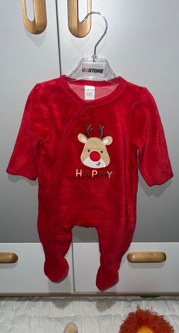 3-6 ay kadife tulum. 2 kez giyildi. Renkli kırmızı bebek tulumu, uzun kollu ve yumuşak dokulu. Bisiklet yaka ve 'HAPPY' yazılı örgü geyik baskılıdır.