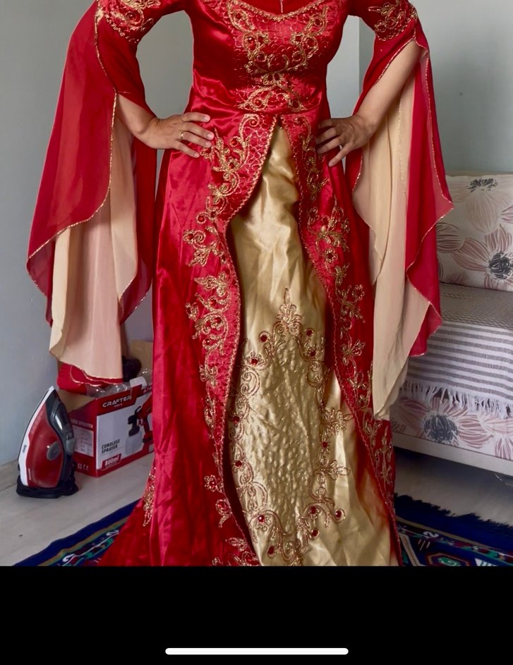 Parlak nakış detaylı, drapeli uzun kollu kırmızı, ve vücuda oturan bindallı , kınanız için çok iyi durumda bir defa giyildi