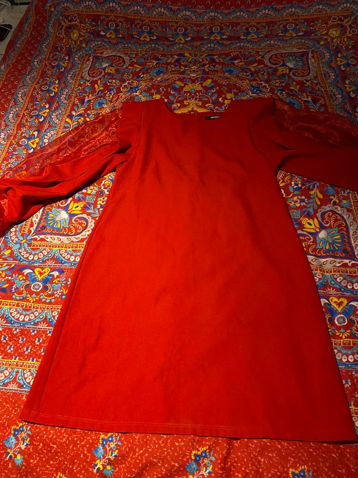 Uzun, bol kesim kırmızı elbise, uzun kollu ve drapeli tasarımıyla bohem düğünler için uygundur.