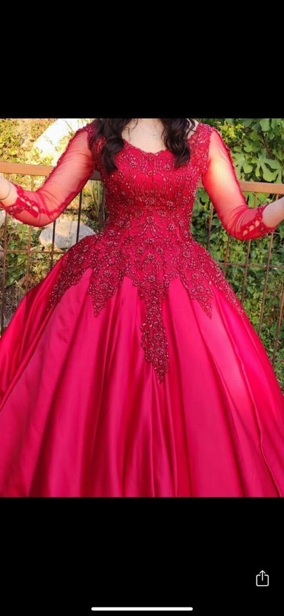 Uzun kollu, tekne yakalı kırmızı kına elbisesi, boncuk işlemeleri ve parlak görünümüyle klasik ve gösterişli bir şıklık sunar.
