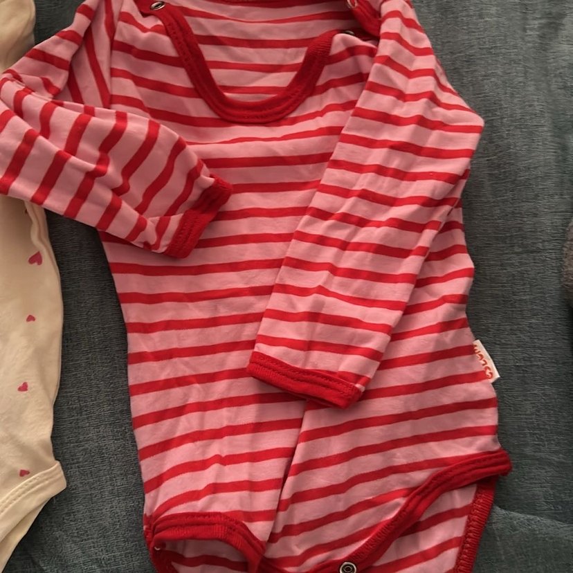 Uzun kollu, kırmızı renkli çizgili ve düğmeli bebek body, yuvarlak yakalıdır. 6-9 ay