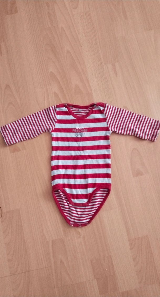 Uzun kollu, V yaka, kırmızı çizgili renkli bebek body. Örgü kumaşıyla rahat ve yumuşak kullanım sağlar. 9 ay 74 cm markası kanz sorunu yok. az kullanılmıştır
