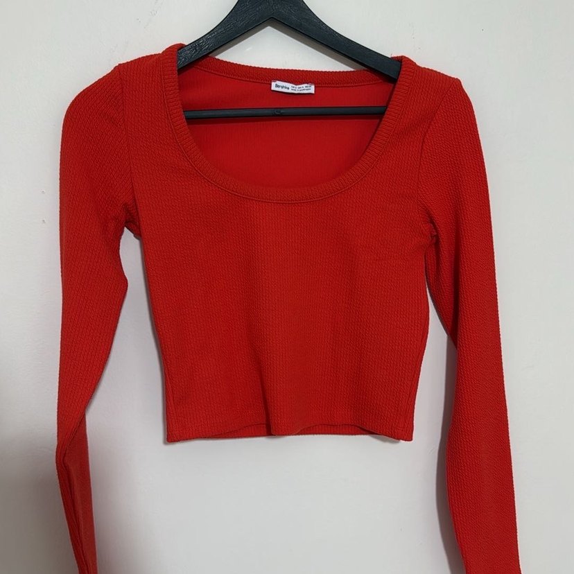 Uzun kollu, yuvarlak yakalı kırmızı crop top, düz ve rahat sentetik kumaştan. Günlük sokak stiline uygun, minimal bir tasarım.