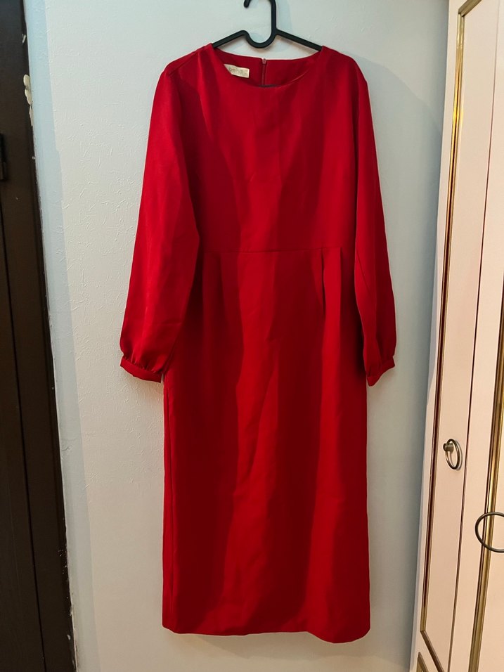 Uzun kollu, dökümlü detaylara sahip kırmızı elbise, rahat kesim ve satenimsi kumaştan üretilmiştir. Minimalist tasarımıyla ofis kullanımı için uygundur.
