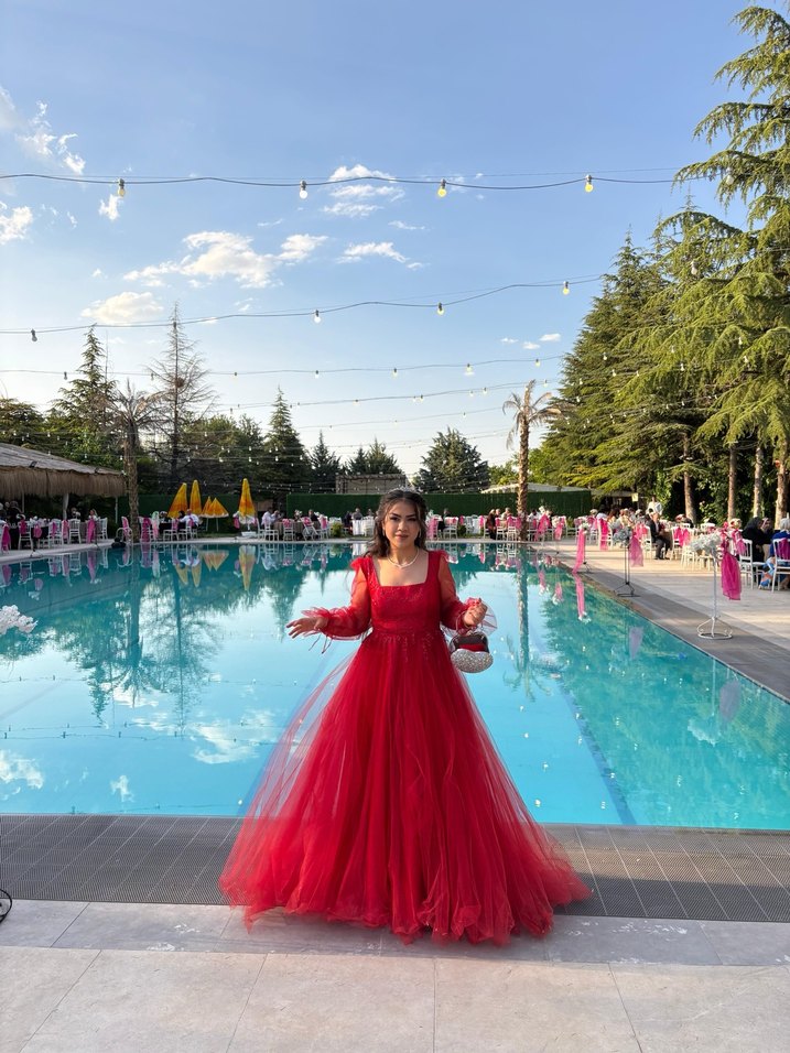 Uzun Kollu Kırmızı Drape Detaylı Abiye