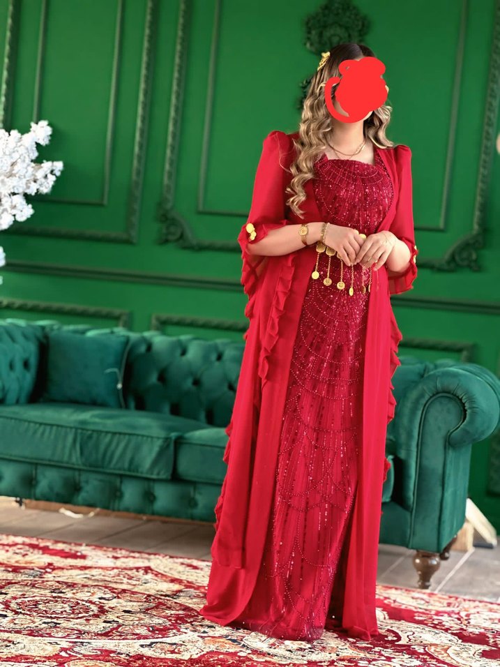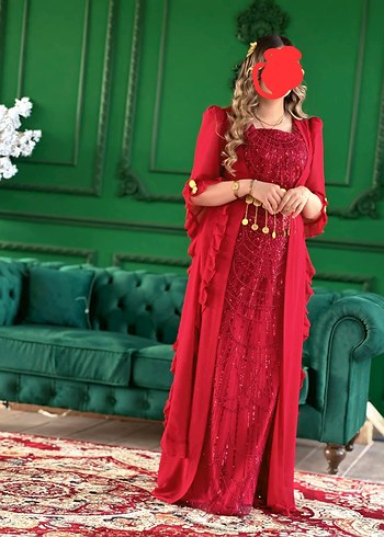 Uzun kollu, straplez yakalı ve bol kesimli kırmızı henna elbise. Parlak, desenli kumaş ve drape detaylarla düğünler için uygun, mütevazı ve bohem tarzda.