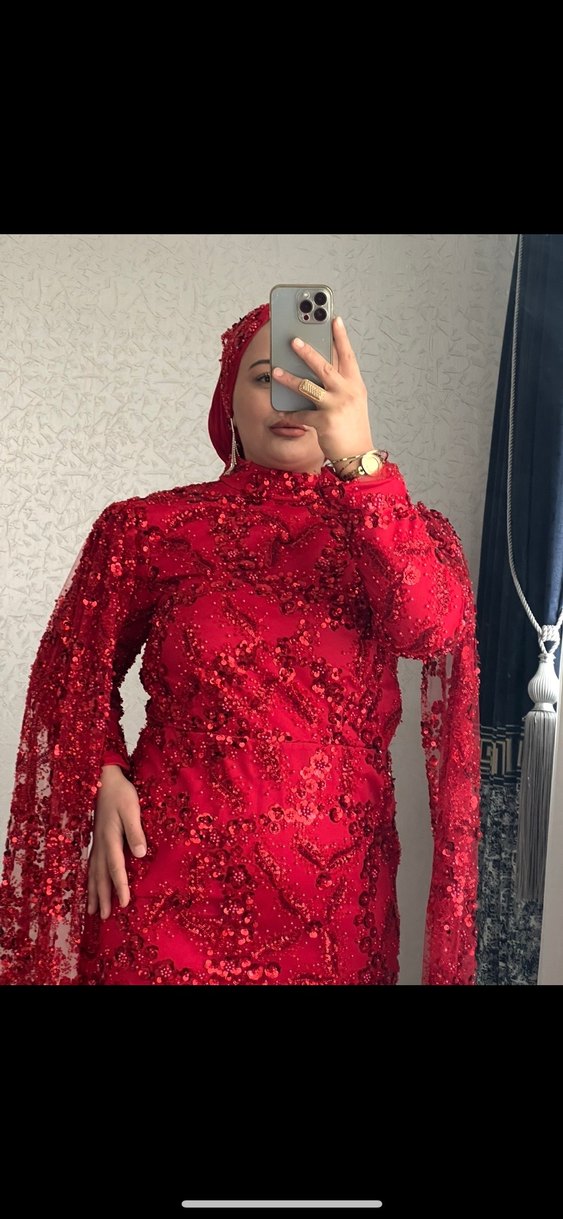 Koyu kırmızı renkte, yüksek yakalı ve uzun kollu, drapeli detaylara sahip oturan uzun abiye elbise. Düğünler için uygun, mütevazı tve gösterişli bir görünüm sunar.