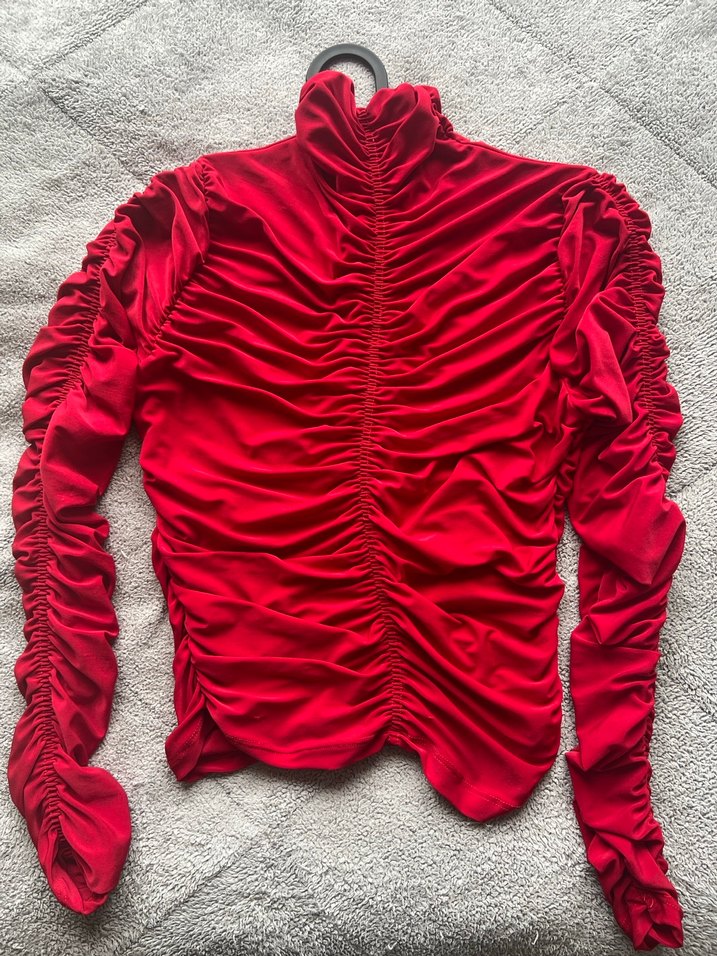 Bu dar kesim kadın bluz, yüksek yakalı ve uzun kollu olup drapeli detaylara sahiptir. Yumuşak sentetik kumaştan yapılmış, canlı kırmızı rengi ve avangart tarzıyla parti ve sokak modasına uygundur.