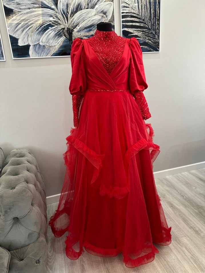 Uzun Kollu Kırmızı Drapeli Kadın Abiye