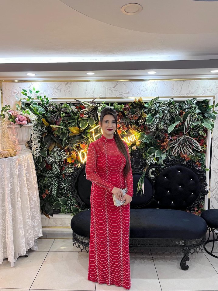 Uzun Kollu Kırmızı Drapeli Kadın Abiye