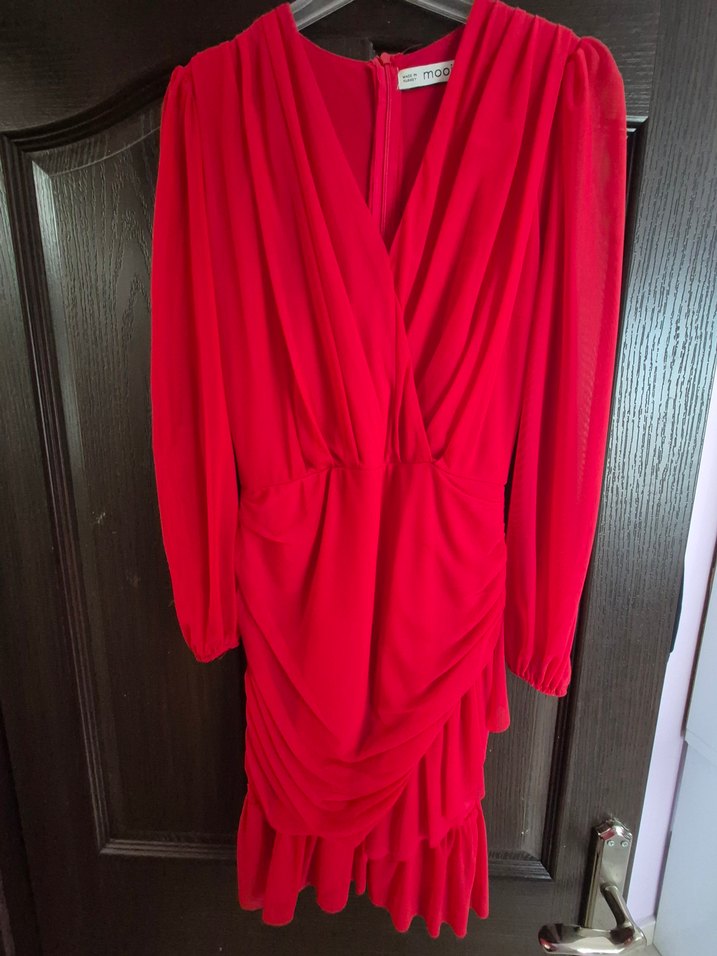 Uzun Kollu Kırmızı Drapeli Kadın Abiye Elbise