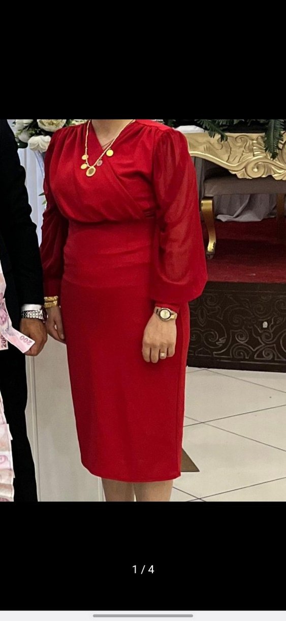 Uzun, vücuda oturan kırmızı kalem elbise, parlak ve ipeksi kumaş ile drapeli tasarıma sahiptir. V yaka ve uzun kolludur, klasik düğün stiline uygundur.